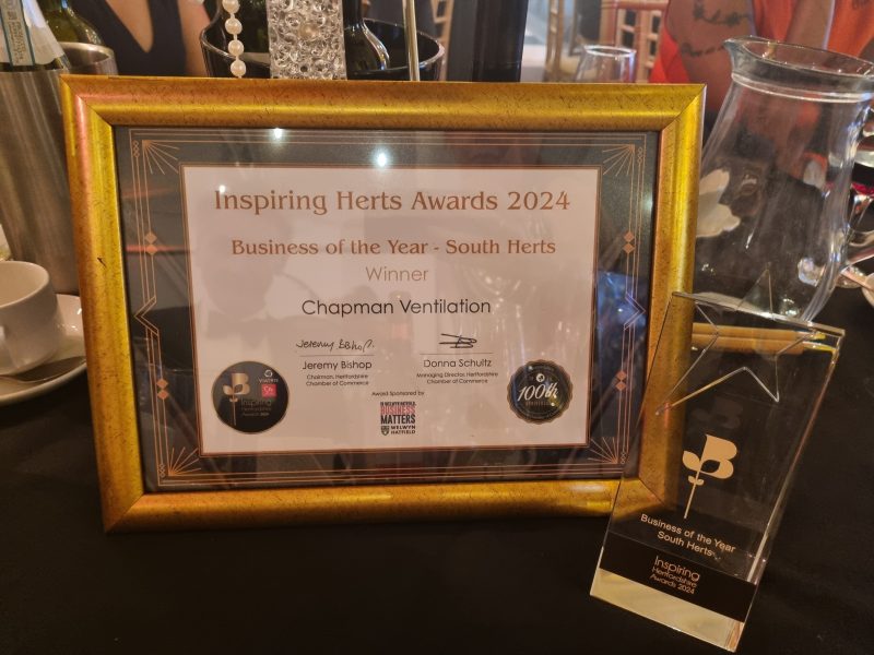 We entered the Business of the Year South Hertfordshire category and despite tough competition, we were thrilled that Chapman Ventilation was named the winner! Our business won the award because of our continual growth and prominence in the hospitality sector, loyalty to our employees, work on sustainability and support for our local community.